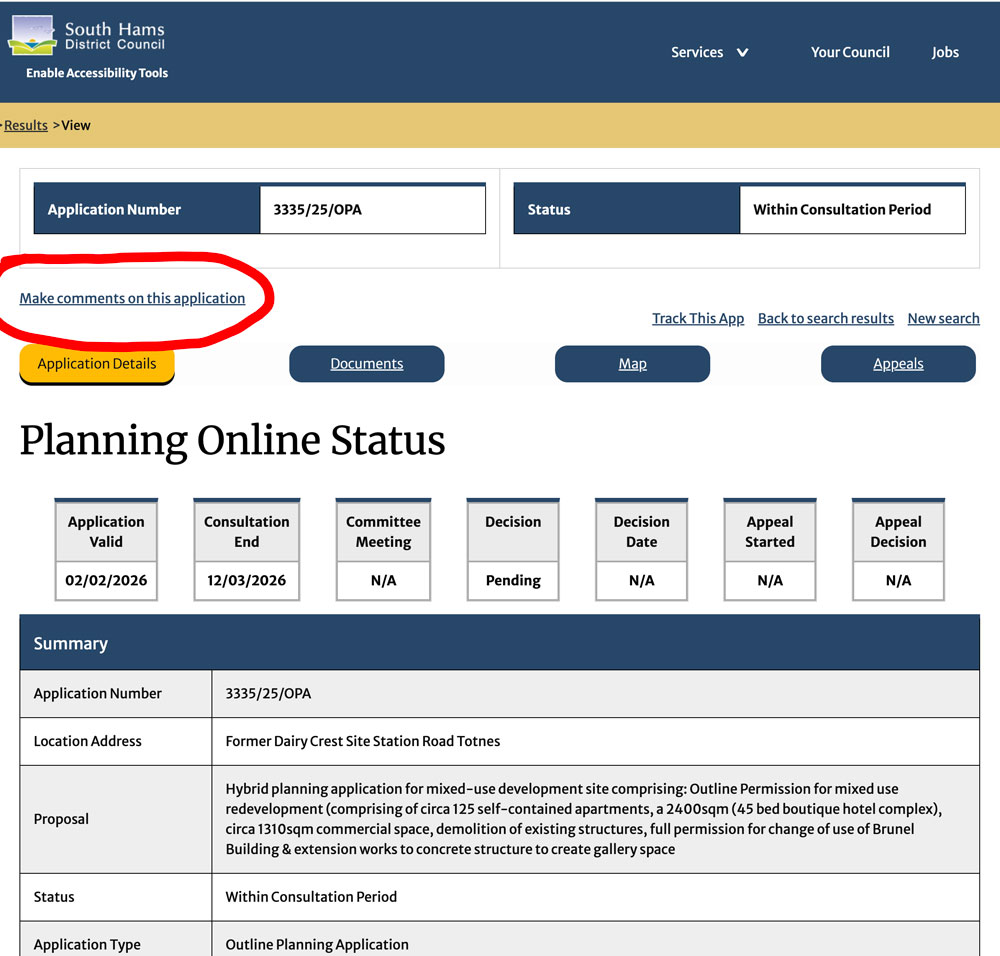 Go to https://southhams.planning-register.co.uk/ and search for 3335/25/OPA. Click in the underlined application number the click on: Make comments on this application